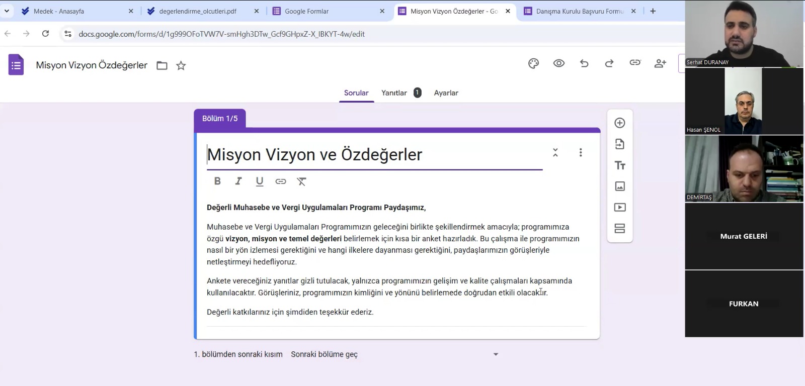 Yüksekokulumuz Muhasebe ve Vergi Uygulamaları Programı 06.02.2026 tarihinde Program Danışma Kurulu ile online bir toplantı gerçekleştirmiştir. Toplantıda öncelikle Danışma Kurulu üyeleri, MEDEK akreditasyon süreci ve programımızın bu süreçte gerçekleştirmiş olduğu ilerlemeler hakkında bilgilendirilmiştir. Ardından yürütülmekte olan kalite çalışmalarına kurul üyelerinin katılımını arttırmak adına oluşturulan online anketler ve katılım formları değerlendirilmiş ve üyelerin görüş-önerileri alınmıştır. Programımız adına toplantıya katılan ve katkı sunan tüm Danışma Kurulu üyelerimize teşekkür ederiz.