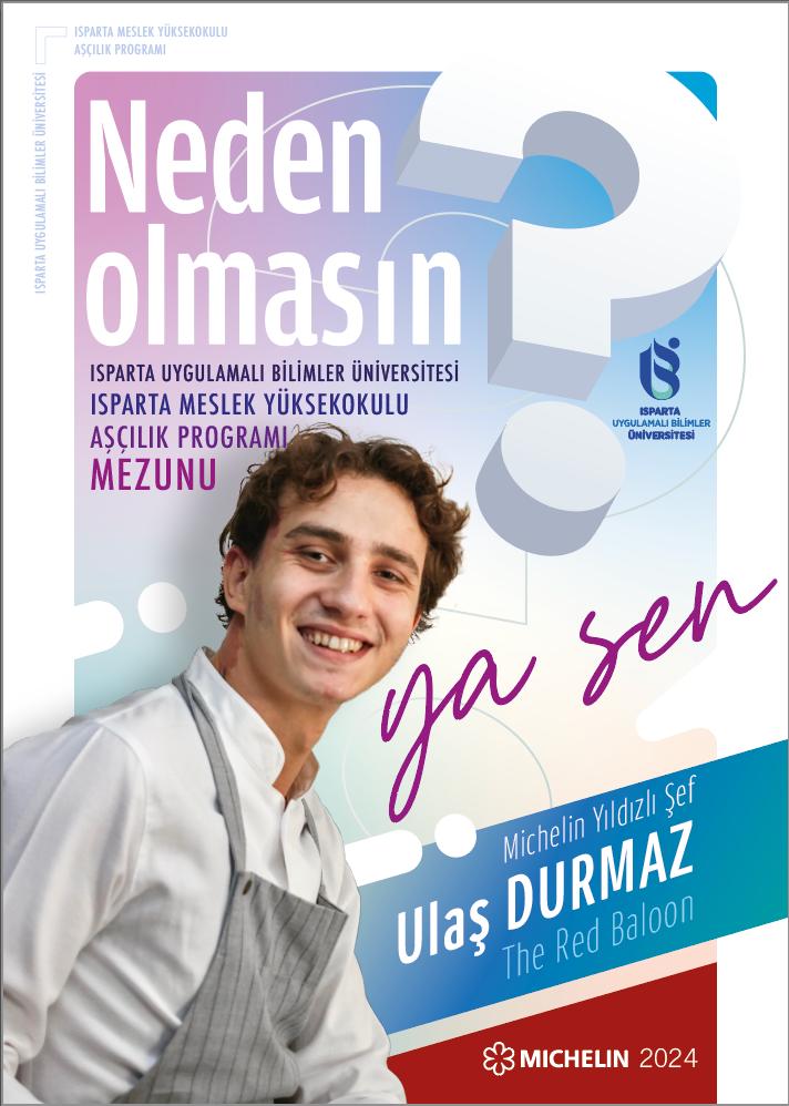 Michelin 2024 Yılı Genç Şef ödülünü alan Üniversitemiz Isparta Meslek Yüksekokulu Aşçılık Programı mezunu Ulaş DURMAZ, aşçılık mesleği ve şuan ki konuma gelene kadar ki yaşamış olduğu süreçleri 19 Şubat Pazartesi günü saat 10:00'da Eğirdir Meslek Yüksekokulu Şehit Komiser Osman DEMİR Konferans Salonunda ve saat 13:00'da Isparta Meslek Yüksekokulu 50.yıl Konferans Salonunda öğrencilerimizle bir araya gelerek paylaşacaktır.